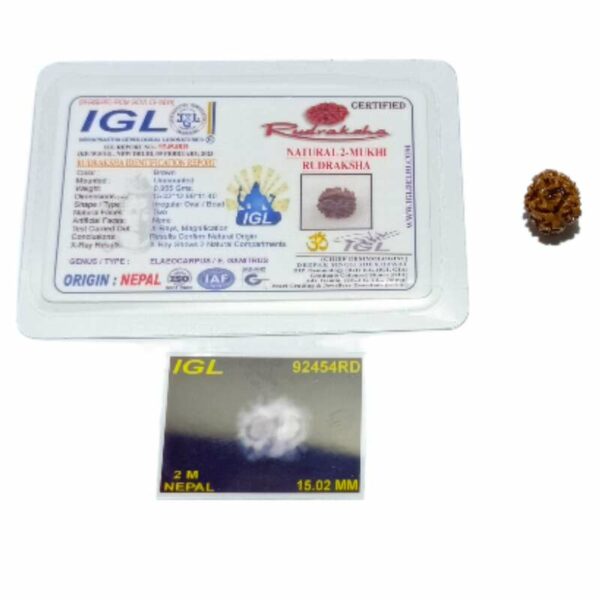 The 2 Mukhi Rudraksha further balances the material and spiritual aspects of human life.Wear it to enhance your connect to yourself, others and the divine supreme.It is considered to effective for sleep disorder. It can be worn for chronic cough and cold and other problems related to the chest region.It is said to be extremely good for mental peace and a calm demeanour. It is effective in enhancing concentration and helps in channelizing the energy of Svadhisthana Chakra.It is also useful in getting rid of the malefic effects caused by adverse positioning of Moon. This bead gives relief in ailments of Kidneys.Where a single 2 Mukhi Rudraksha is excellent to place in the house or place of worship for a harmonious relationship, a Moon Mala (2 Mukhi Mala) is good for Chandradosh Nivaran.